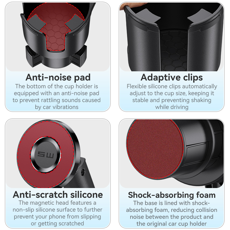 Universal Telescopic Base: The expandable base is designed to fit securely in most standard car cup holder slots, providing a stable foundation for both your drink and your phone.