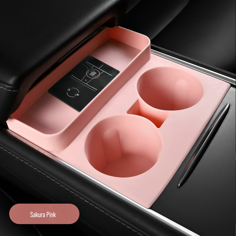 This front-facing silicone armrest box is specifically designed for New Energy Tesla Model 3 & Y vehicles (2021-2023 models). It serves as a multifunctional storage solution, integrating a car cup and water cup holder with additional storage space, enhancing the interior organization and convenience. The product is made from high-quality silicone material, ensuring durability and a sleek, black finish that complements the car's interior.