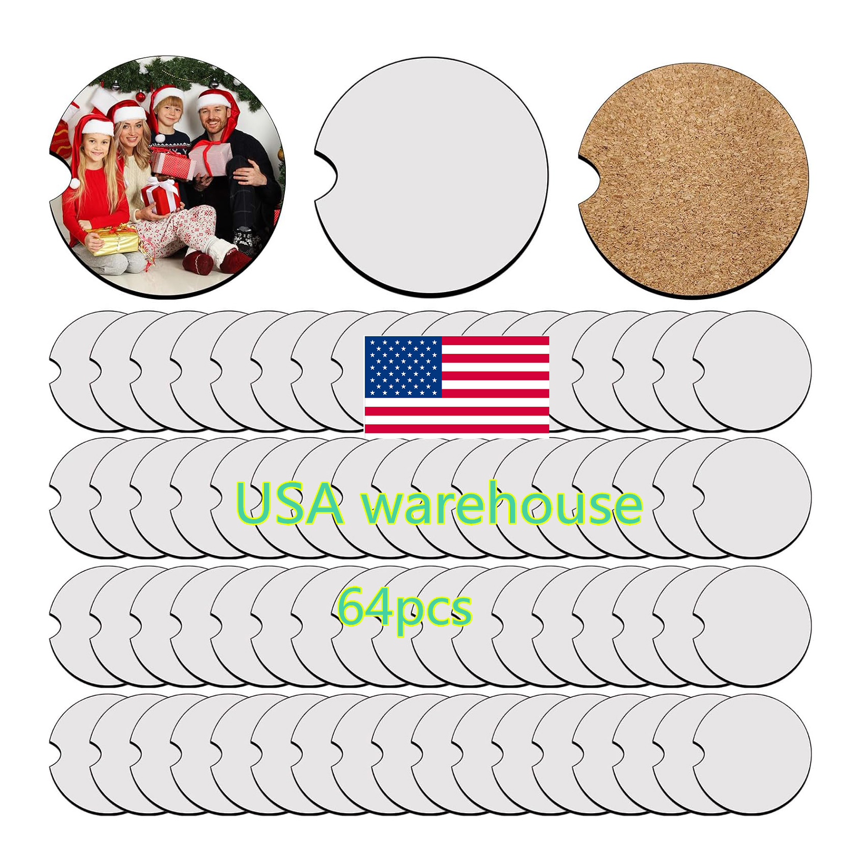 This product is a set of 64 blank car coasters designed specifically for the sublimation printing process. Each coaster is crafted with a Medium-Density Fibreboard (MDF) top layer, ideal for accepting sublimation ink, and a natural cork backing. The cork backing provides excellent grip and heat insulation, protecting your vehicle's cup holder surfaces from condensation and heat. With a standard size of 2.75 inches and a square shape, these coasters are perfectly sized for most car cup holders. This set ships for free from a USA warehouse, ensuring fast and reliable delivery for customers in the United States.
