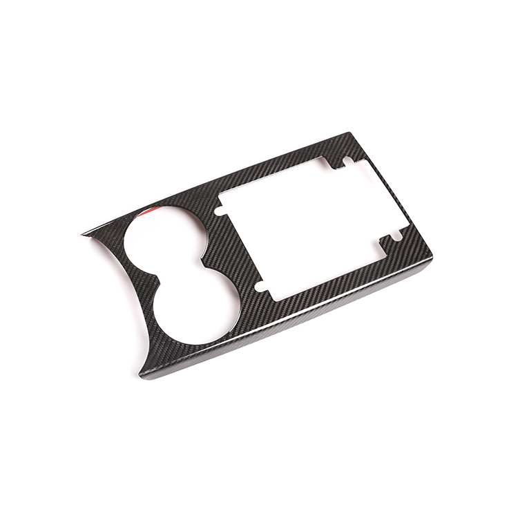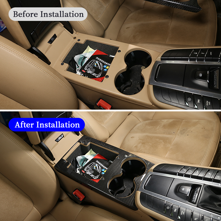 This product is a high-gloss carbon fiber decorative cover designed specifically for the center console cup holder area of the Porsche Macan. Manufactured by Dongguan Aikeliwei Carbon Fiber Technology R&D Co., Ltd., it serves as a luxury upgrade to enhance the interior aesthetics of your vehicle while providing scratch resistance.