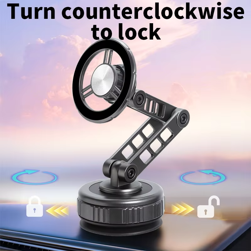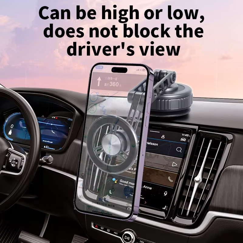 This high-quality car phone holder features a robust zinc alloy construction and a powerful suction cup designed for secure placement on your dashboard or windshield. The holder offers 360-degree rotation for optimal viewing angles and utilizes a strong magnetic mount for easy, one-handed attachment of your phone. It is a universal model, compatible with most smartphones on the market.