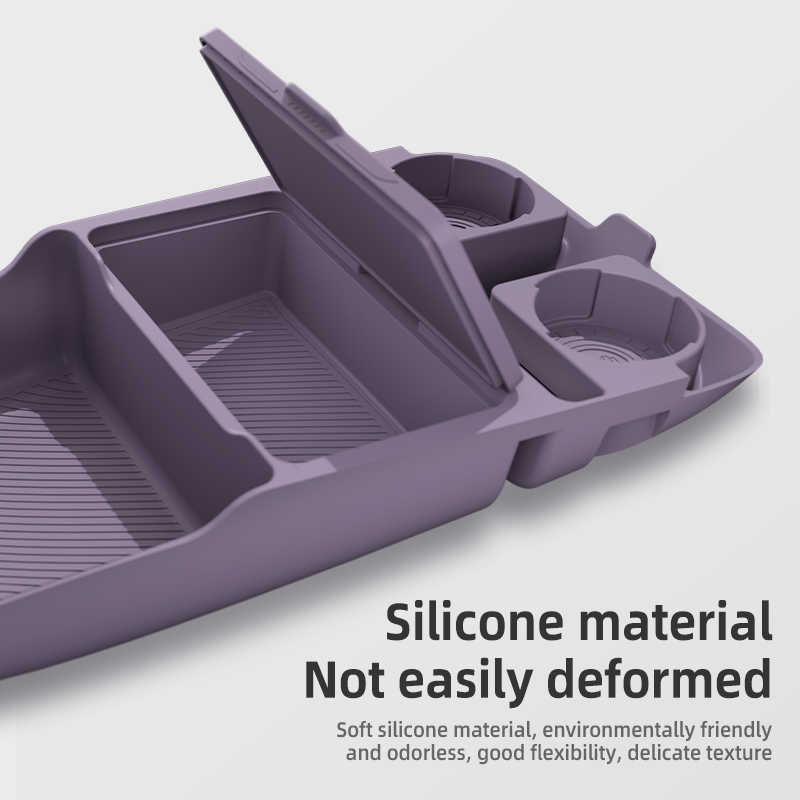 Its flexible silicone material allows it to fit snugly into the console, preventing it from sliding during driving. The multiple compartments help in segregating items for easy access.