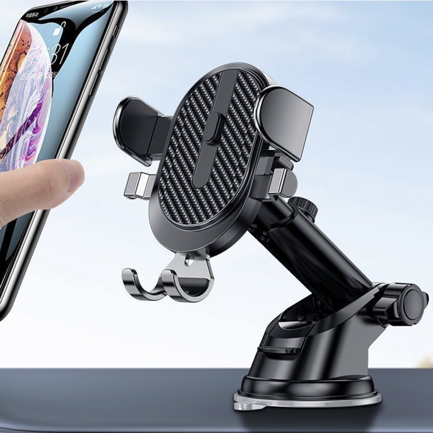 This universal car phone holder is designed for safe and convenient hands-free navigation and calling. Featuring a robust suction cup for dashboard or windshield mounting and a 360-degree rotating ball head, it provides optimal viewing angles for any smartphone. The carbon fiber-patterned silicone surface ensures a secure, non-slip grip while protecting your device from scratches.