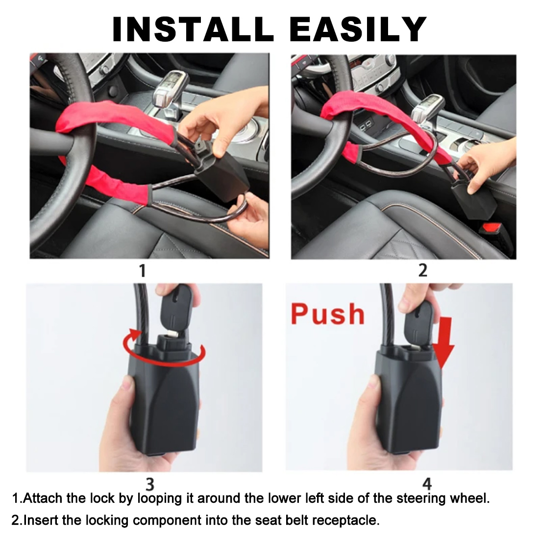 Test the Installation: Gently tug on the lock to confirm it is securely in place and prevents the steering wheel from turning.