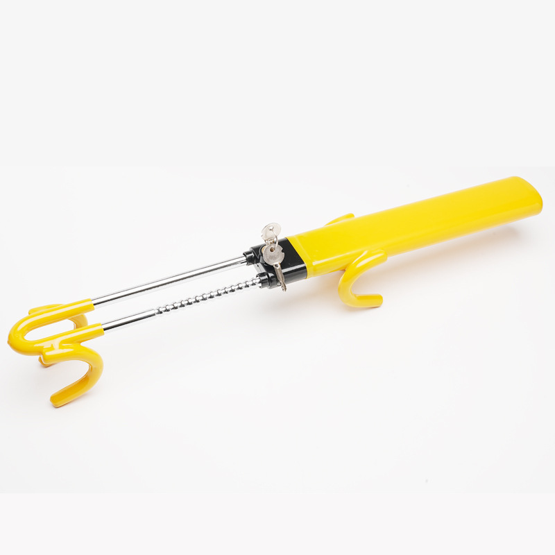 This is a universal T-shaped steering wheel lock designed as a robust vehicle anti-theft device. It features an adjustable length steel clamp with a double hook mechanism, providing a visible deterrent against potential car thieves. Crafted from high-quality metal, its bright yellow color ensures high visibility, further enhancing its security function. The lock is designed to be universally compatible with most car models and comes with two computer keys for convenient access.