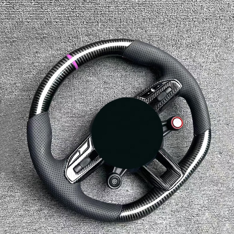 This custom carbon fiber steering wheel is designed for automotive enthusiasts looking to upgrade their vehicle's interior for a sportier look and feel. It is suitable for a wide range of car models and can be customized to fit specific requirements. The product is intended for retrofit and upgrade purposes, enhancing both the aesthetic appeal and the tactile experience of driving.