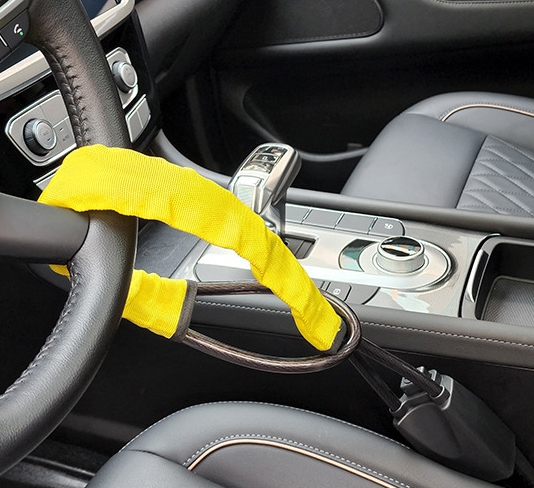 Pros: High visual deterrent, easy to install and remove, lightweight and portable for storage in the glove box, universal fit.