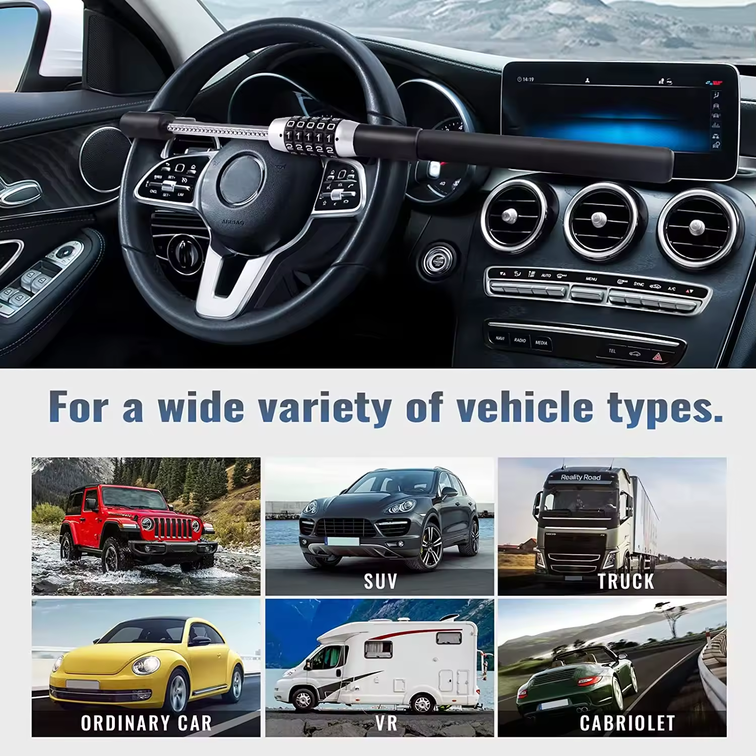 The universal steering wheel lock is designed for straightforward operation. First, set your personal 5-digit combination code according to the manufacturer's instructions. When leaving your vehicle, extend the lock bar across the steering wheel, ensuring it locks securely in place. The robust construction prevents the steering wheel from being turned, providing a strong visual deterrent against theft.