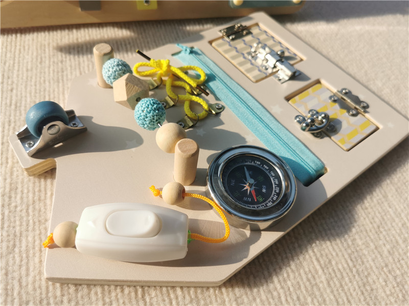 The busy board is designed for intuitive exploration. Children can independently interact with the various elements: