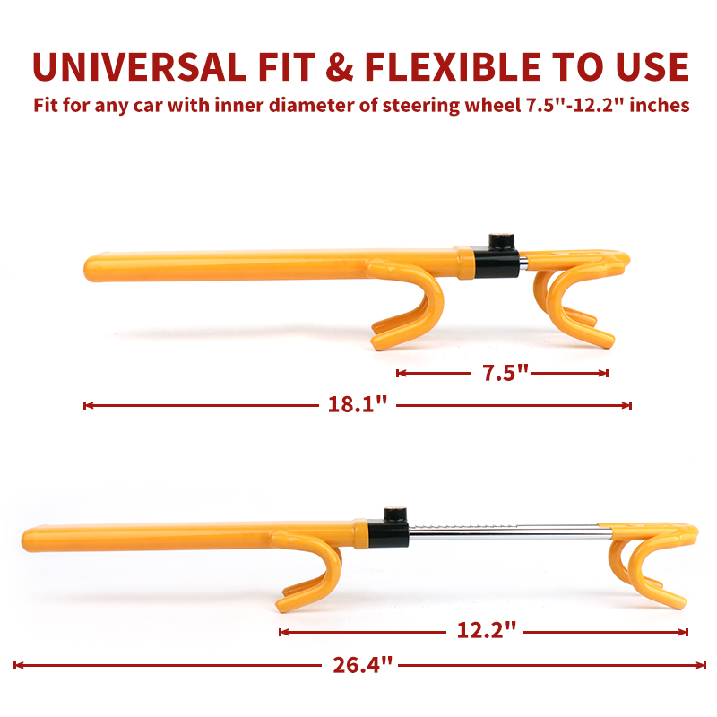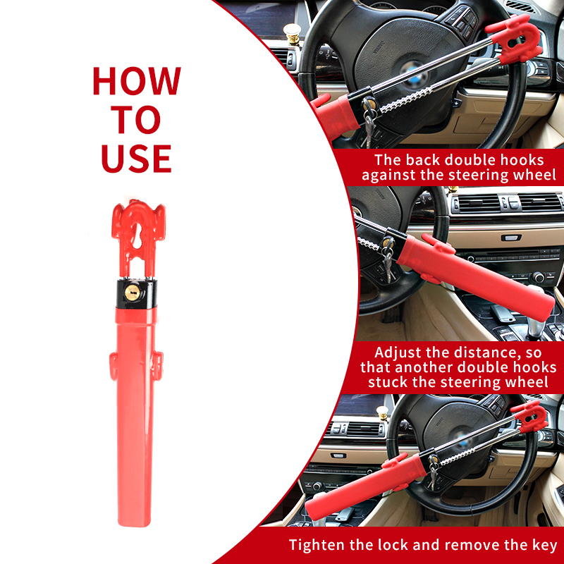 Using the X-Racing steering wheel lock is straightforward. Extend the U-shaped bar to fit around the steering wheel rim and a fixed part of the interior (such as another section of the wheel or the dashboard support). Insert the key, turn to lock, and remove the key. The double-hook design ensures it remains securely fastened, physically preventing the steering wheel from being turned. To remove, simply insert the key, unlock, and retract the bar.