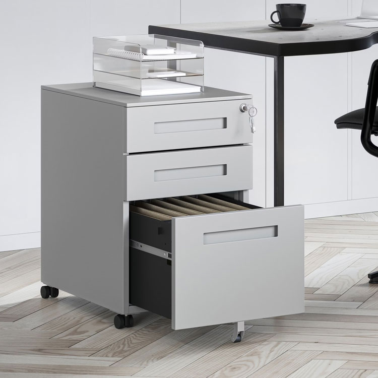 This rolling file cabinet is designed for versatile use in various environments. Its primary application is in office settings, where it serves as an efficient storage unit for documents, files, and office supplies. It can be easily placed under a desk to save space or used as a standalone storage unit in a home office, library, or study room. The lockable drawers provide security for sensitive documents, making it suitable for HR departments, accounting offices, or any workspace requiring confidential storage. Additionally, its mobility allows users to move it around the office as needed, enhancing flexibility in workspace organization.
