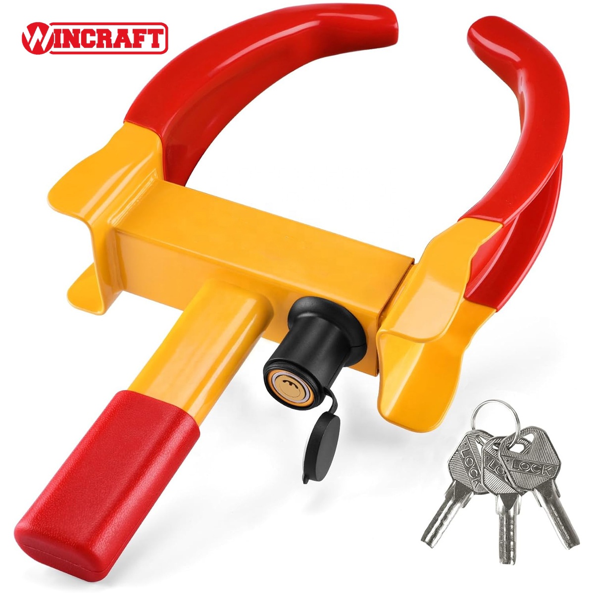 A heavy-duty, high-visibility security device designed to immobilize vehicles and deter theft by clamping onto the tire. This universal fit model is suitable for cars, trucks, SUVs, vans, campers, and motorcycles.