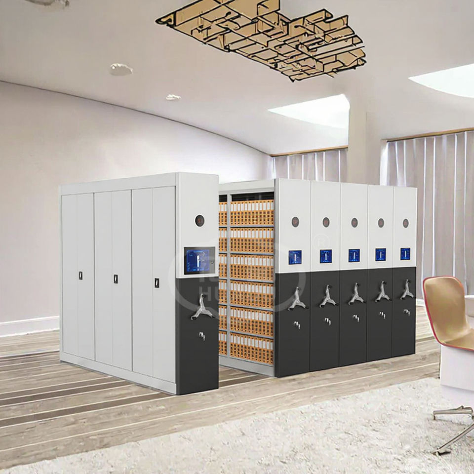 This smart modern design metal filing cabinet is a versatile storage solution engineered for high-density environments. Featuring a mobile compactor system with a steering wheel for effortless maneuvering, it maximizes space efficiency in offices, hospitals, schools, and even outdoor settings. Constructed with durable metal and a sleek panel design, it combines functionality with contemporary aesthetics.