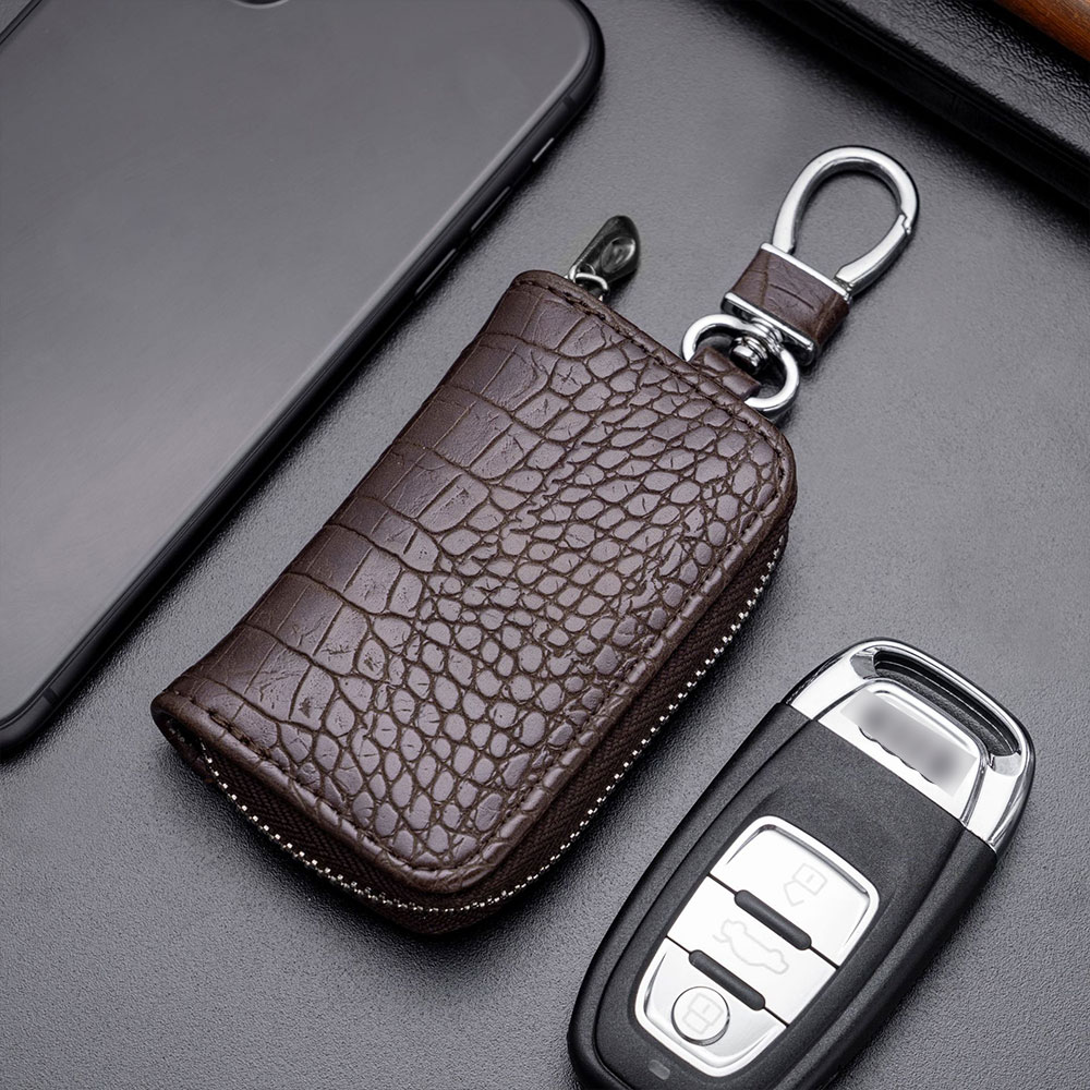 This universal car key bag is a stylish and practical accessory designed to protect your car keys from scratches, dust, and daily wear and tear. Featuring a sophisticated crocodile print pattern and crafted from durable leather, it combines functionality with a premium aesthetic. The product is designed as a zippered pouch, offering secure storage for your keys while adding a touch of elegance to your essentials. It is a universal fit, making it compatible with most car key fobs.