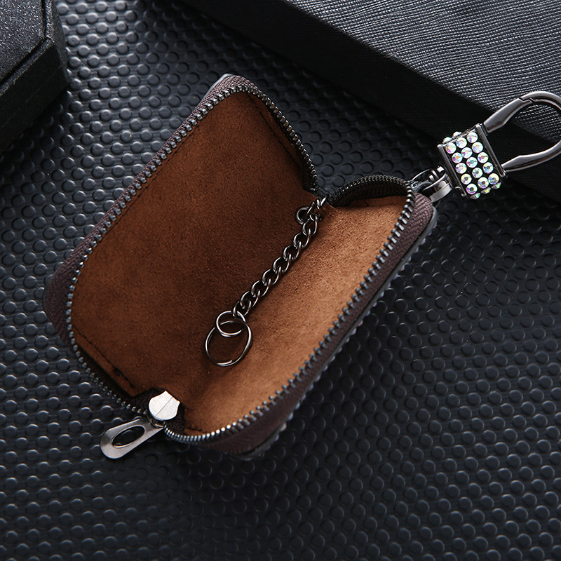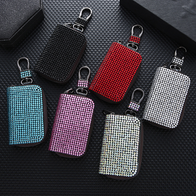 This high-quality creative car accessory is designed as a stylish and functional key holder, specifically catering to users seeking a blend of luxury and practicality. It serves as a decorative protective cover for car keys, featuring a full diamond (rhinestone) embellishment on a leather base. The product is aimed at adding a personal and elegant touch to your keys while safeguarding them from scratches and daily wear and tear.