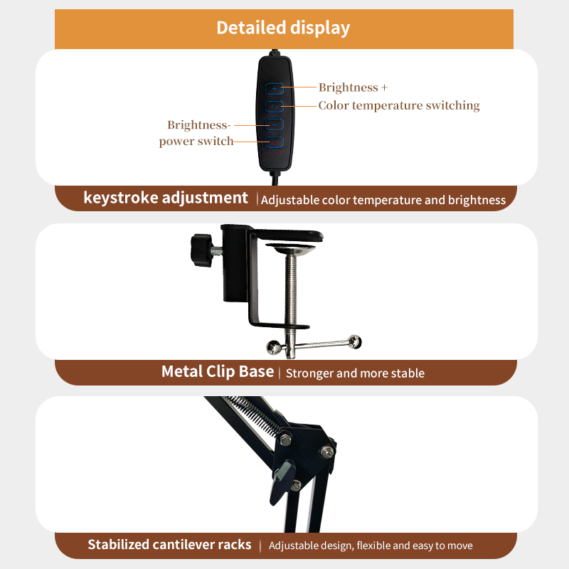 Office and Desk Work: The clamp base securely attaches to desks, shelves, or headboards, saving valuable desk space. The USB power compatibility means it can be easily powered by a laptop, power bank, or standard USB wall adapter, enhancing its portability for office use or remote work setups.