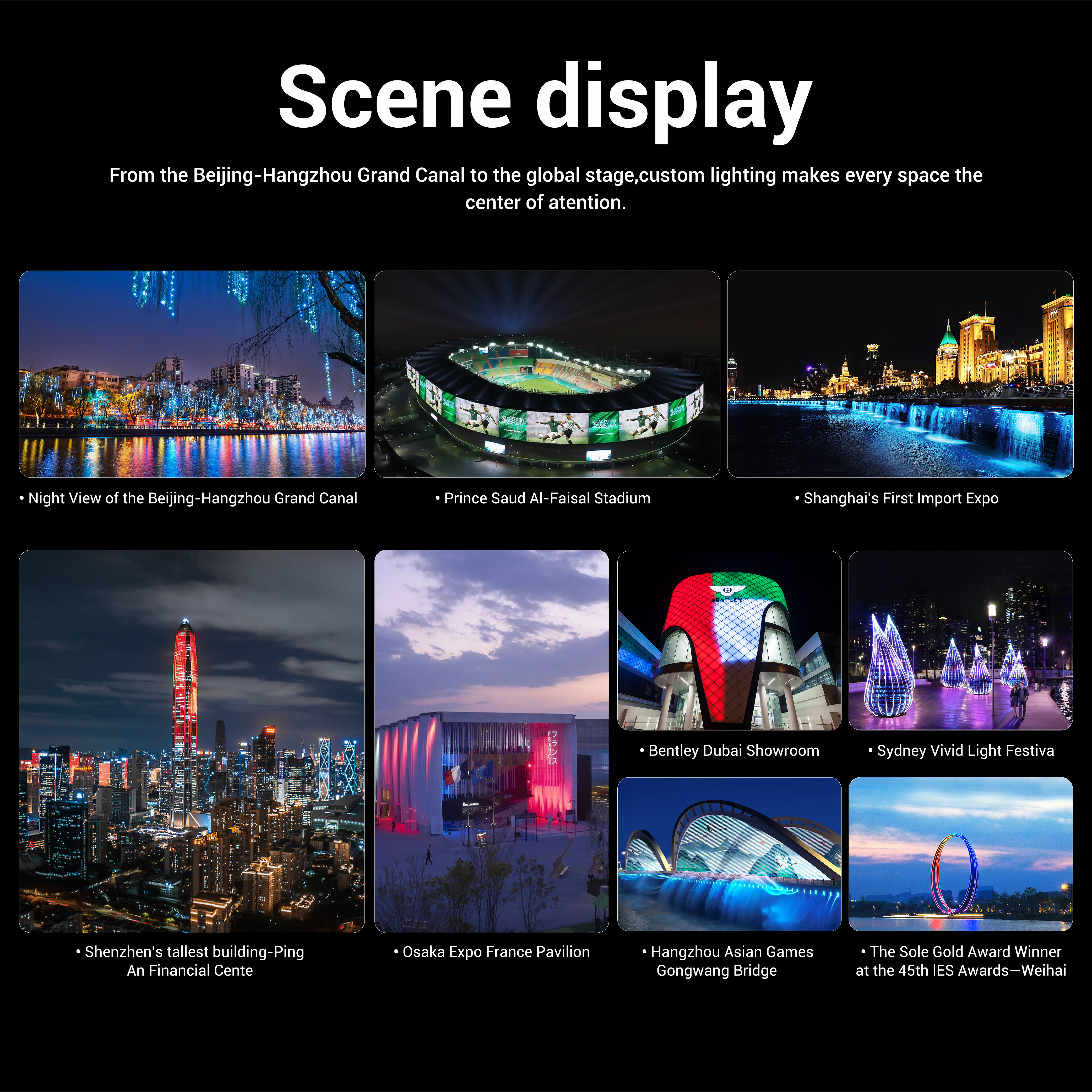 - Architectural Facade Lighting: Highlight the unique contours and features of buildings with dynamic color-changing effects.